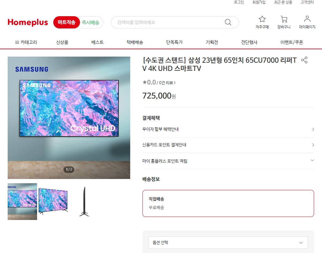 삼성TV 23년식 65인치 65CU7000 4K UHD 스마트TV 수도권 스탠드 설치 : 메가mall
