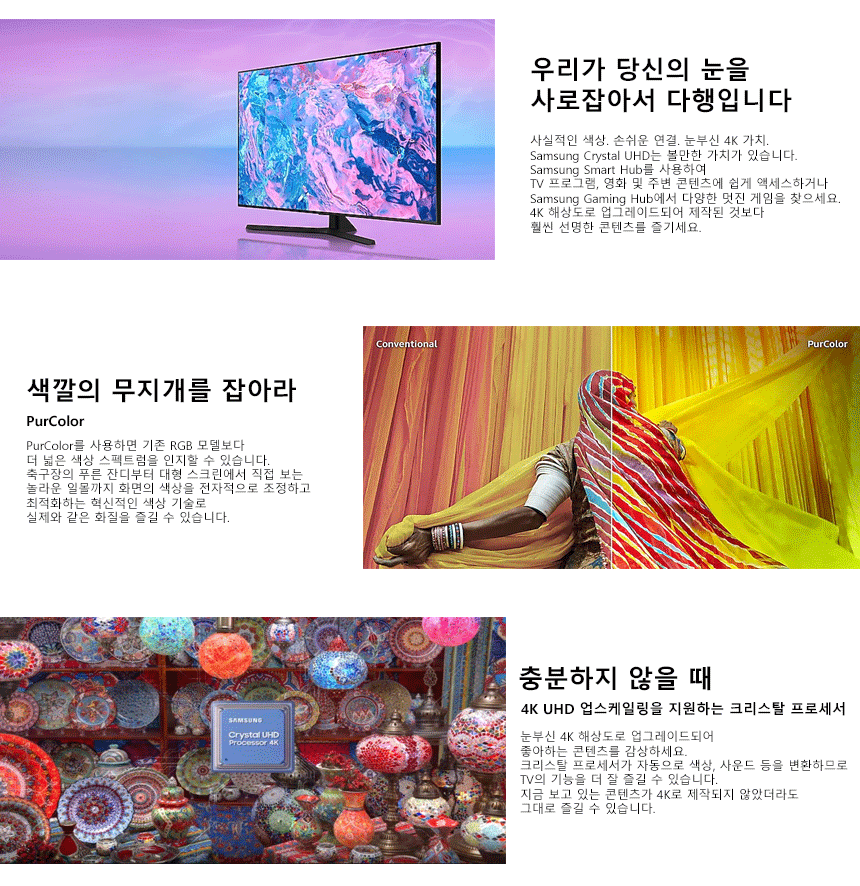 4K UHD 제품은 FULL HD 대비 4배 높은 해상도로 더욱 깔끔하고 선명한 화질을 느낄 수 있으며,