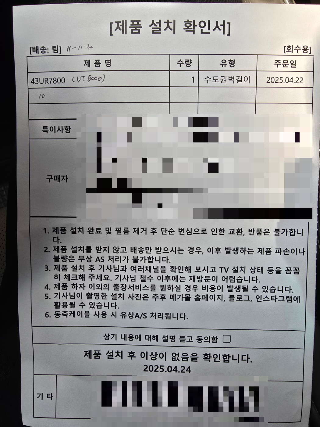 모든 설치 후 TV를 켰을 때 고객님이 "와, 화면 진짜 크고 선명하다~" 하시면서 웃으셨어요!