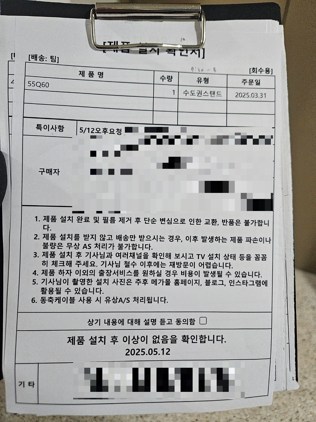 65인치 대형 TV라 더욱 조심스럽게 운반했으며, 고객님 요청에 따라 스탠드형으로 설치해 드렸습니다!